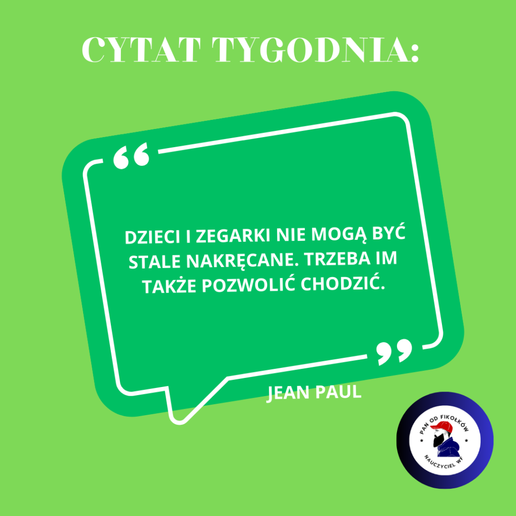 Witajcie w niedzielny wieczór, jutro rozpoczynamy drugi tydzień zmagań. Standardowo podsyłam cytat tygodnia: „DZIECI I ZEGARKI NIE MOGĄ BYĆ STALE NAKRĘCANE. TRZEBA IM TAKŻE POZWOLIĆ CHODZIĆ”. autor Jean Paul. Czyli od jutra wprowadzamy ten cytat w życie i rozpoczynamy kolejny tydzień naszej misji.