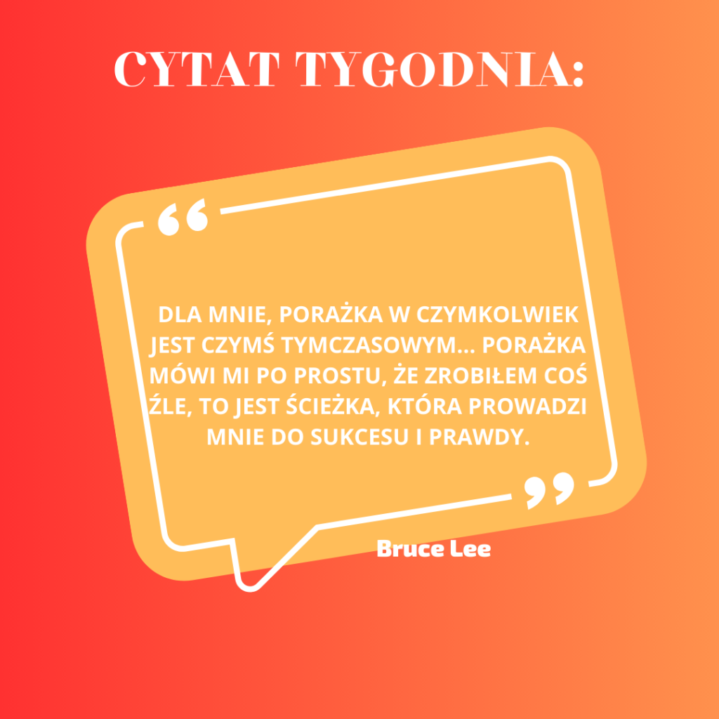 Część Wam !!! Jak minął weekend? Dokonaliście dobrych wyborów podczas głosowania ? Mam nadzieję, że tak. U mnie było aktywnie. Najpierw czas spędzony z synem, potem zagrałem w meczu ligowym w rozgrywkach Klasy A. Obyło się bez kontuzji, chociaż mecz przegrany. Natomiast wieczorem wlatuje co tygodniowy cytat. Autor Bruce Lee wypowiedział kiedyś, bardzo trafne słowa dotyczące porażki. Pasują idealnie do dzisiejszego meczu i nie tylko. A wy jak sobie radzicie z porażkami ? Jak uczycie znosić porażki dzieciaki ? Bardzo interesująca myśl wypowiedziana przez Wielkiego Mistrza sztuk walki. Życzę każdemu takiego podejścia !!!!