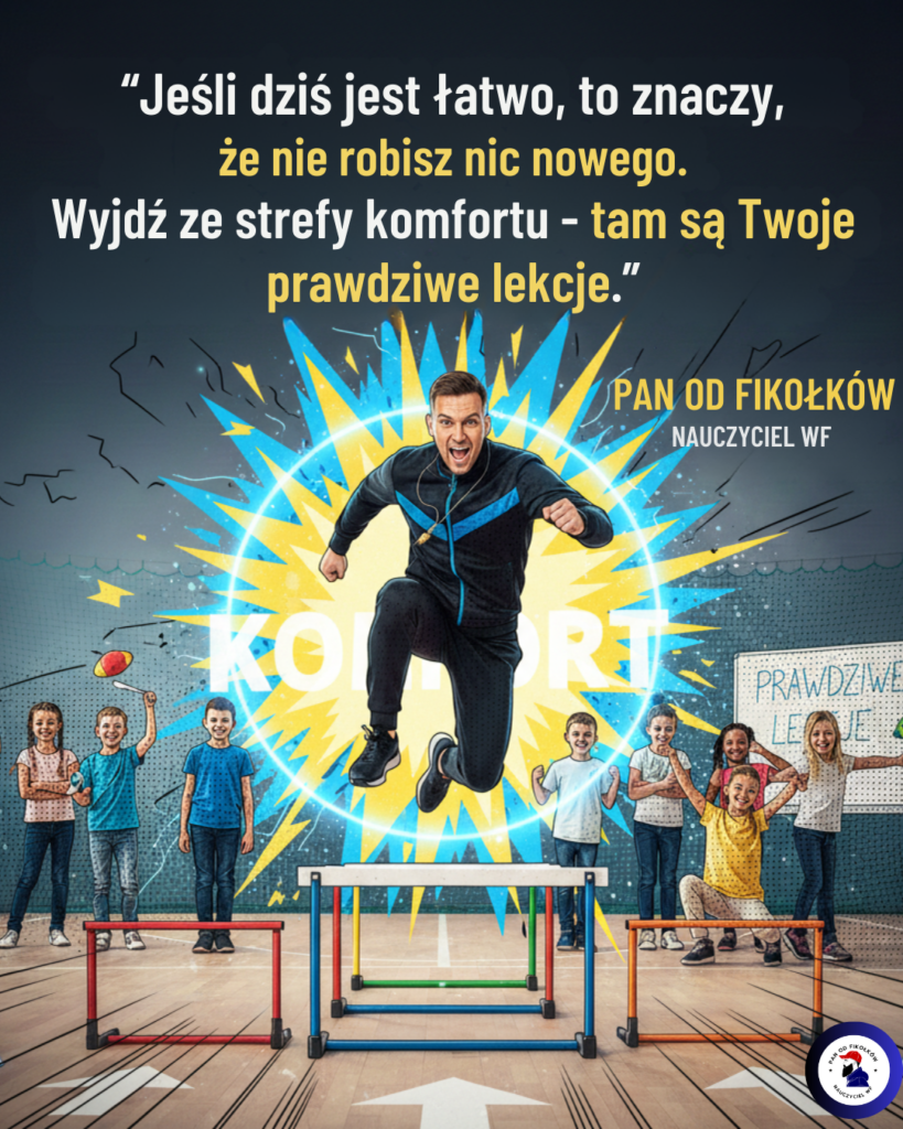 Zatrzymajcie się na chwilę i przeczytajcie ten cytat: "Jeśli dziś jest łatwo, to znaczy, że nie robisz nic nowego. Wyjdź ze strefy komfortu – tam są Twoje prawdziwe lekcje." Dlaczego "łatwo" to pułapka? Wszyscy to znamy. Masz ten swój sprawdzony zestaw ćwiczeń, „bezpieczną” rozgrzewkę, którą dzieciaki robią z zamkniętymi oczami, i gry zespołowe, przy których Ty możesz spokojnie wypełnić dziennik. Jest miło, jest spokój, nikt nie marudzi. Ale czy to jest właśnie to 1% mistrzostwa, do którego dążymy? Prawda jest brutalna: jeśli na lekcji czujesz się zbyt komfortowo, to znaczy, że przestałeś się rozwijać. A nauczyciel, który stoi w miejscu, uczy swoje dzieciaki... stania w miejscu.