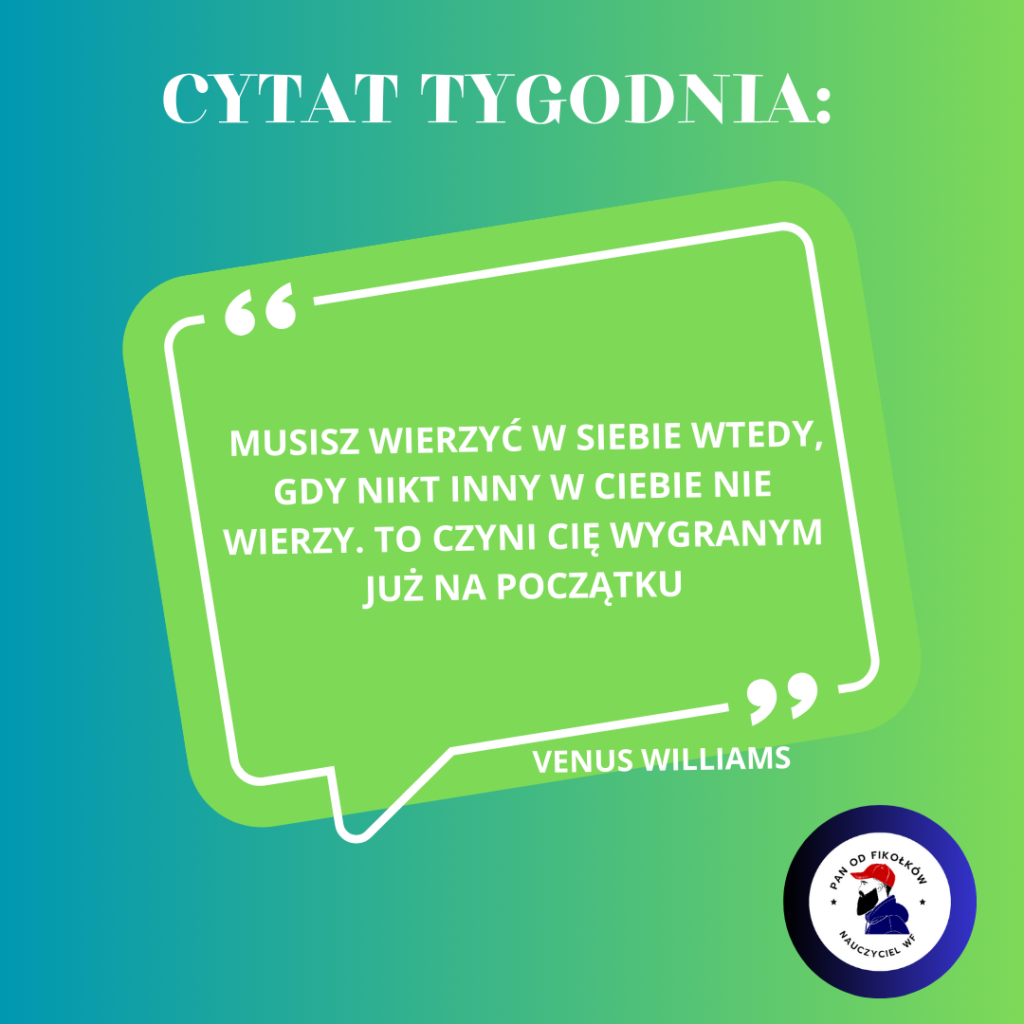 A teraz co niedzielna tradycja czyli cytat tygodnia. Dziś mam dla was takie słowa : „MUSISZ WIERZYĆ W SIEBIE WTEDY, GDY NIKT INNY W CIEBIE NIE WIERZY. TO CZYNI CIĘ WYGRANYM JUŻ NA POCZĄTKU„. autor Venus Williams.