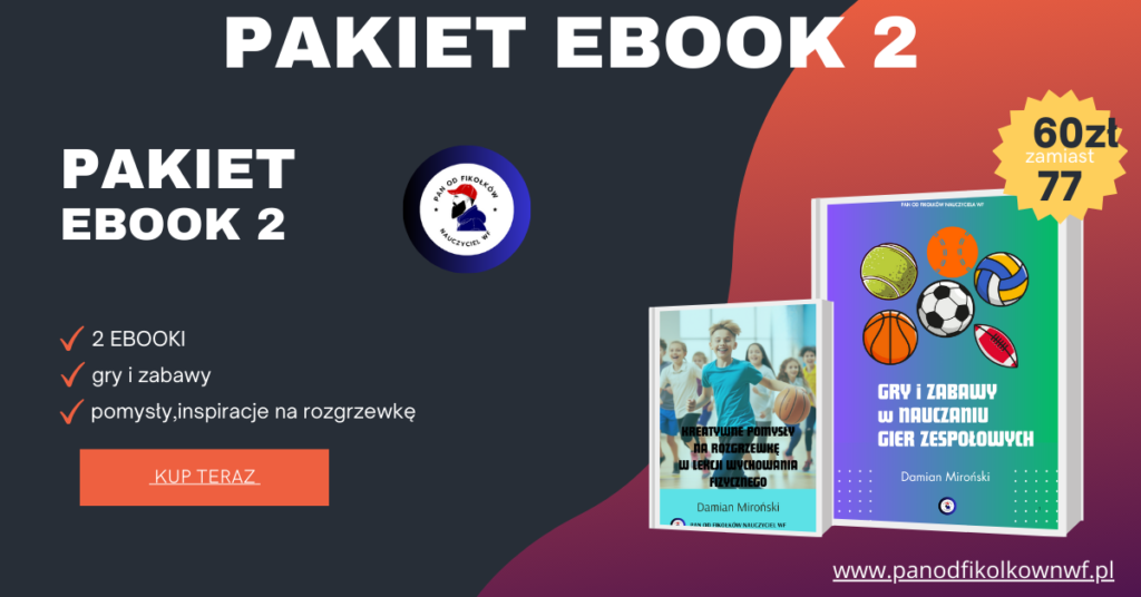 Jest również możliwość nabycia PAKIET EBOOK 2 – to pakiet składający się z 2 ebooków w promocyjnej cenie : 1.Kreatywne pomysły na rozgrzewkę w lekcji wychowania fizycznego. 2. GRY I ZABAWY W NAUCZANIU GIER ZESPOŁOWYCH. link do promocji na pakiet poniżej https://app.easycart.pl/checkout/95037562/pakiet-ebook-2